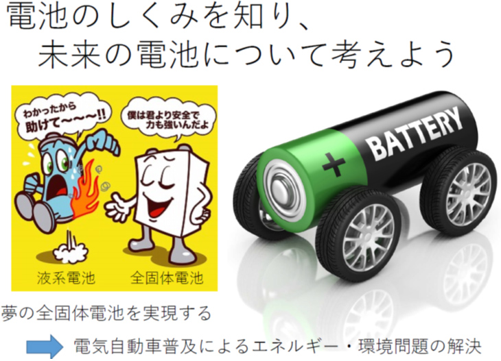 「電池のしくみを知り、未来の電池について考えよう」 白木 将 教授わたしたちの生活に電池は欠かせません。電池の中身はどのようになっているのでしょうか。この授業では、電池の種類や電池が動く仕組み、そして未来の電池についてお話します。